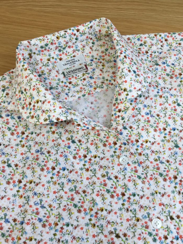 レジウノの小花柄のプリントで、ワンナップカラーに仕立てたレディースシャツ。