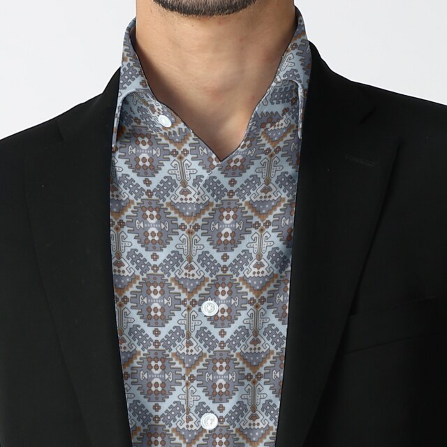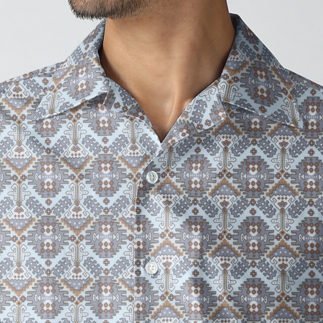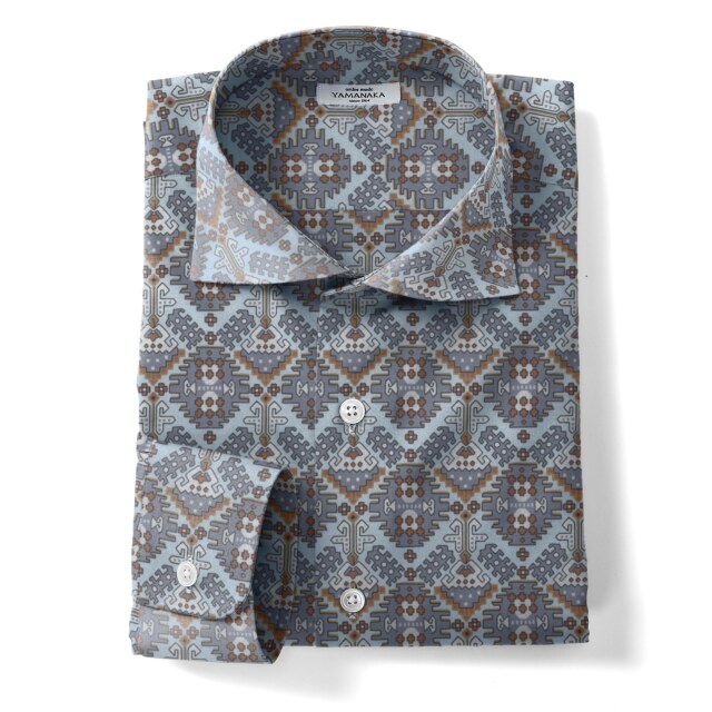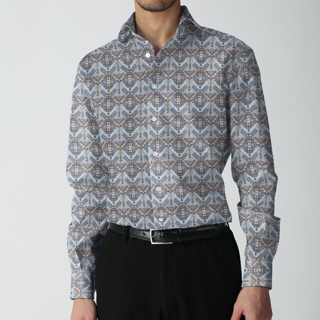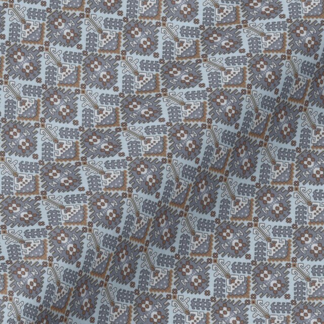ツイル幾何学プリントシャツ生地-グレー | ツイル地に、グレーとブラウンの幾何学プリントシャツ生地。カジュアルシャツ向き。