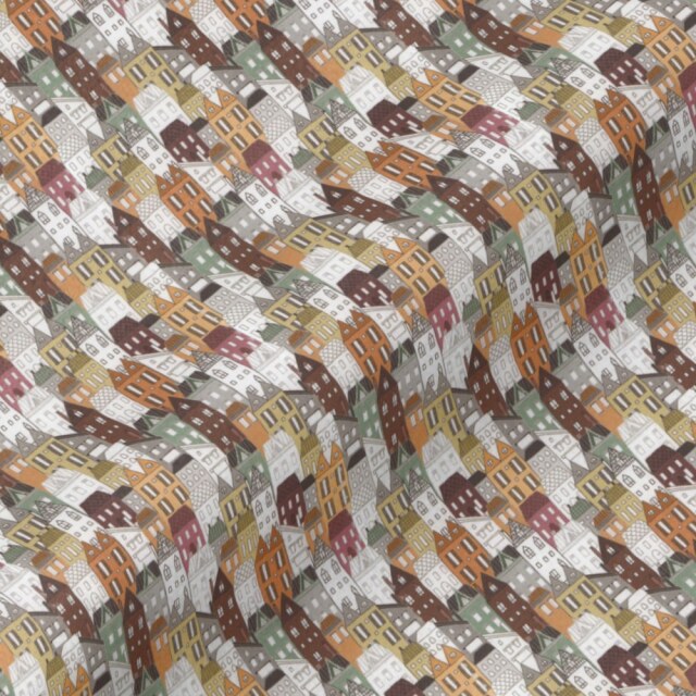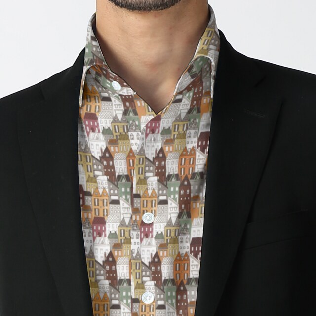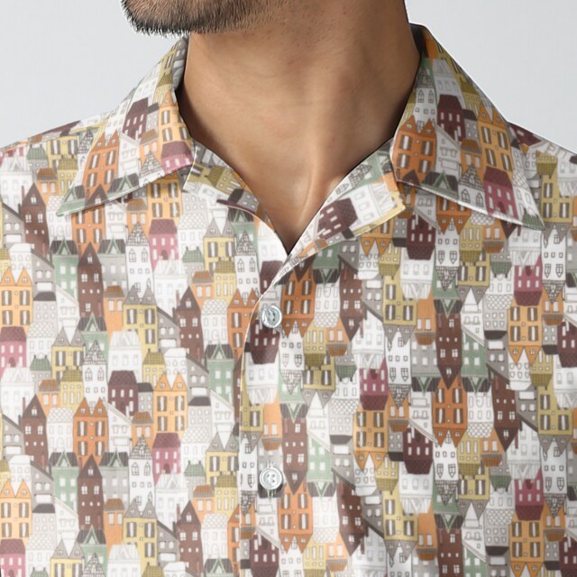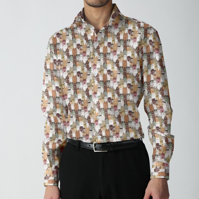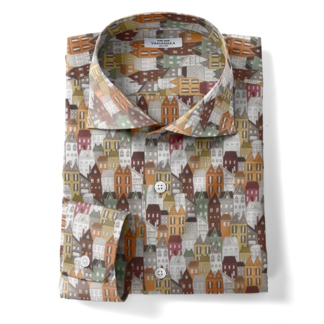 町並みプリントシャツ生地-ベージュ | ブラウン系の町並みプリントシャツ生地。カジュアルシャツ向き。