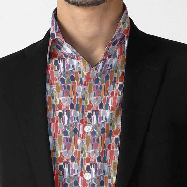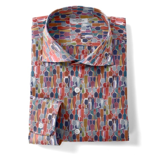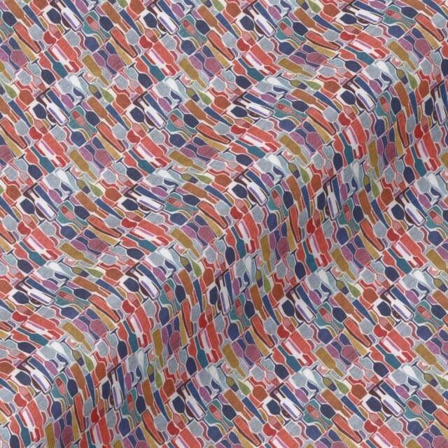 ワイン柄プリントシャツ生地-ネイビー | ワイングラスと、ボトルのプリントシャツ生地。カジュアルシャツ向き。