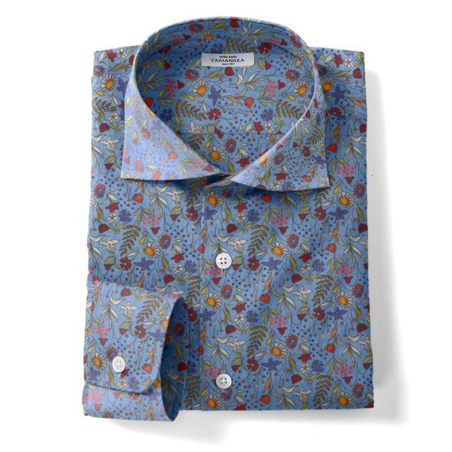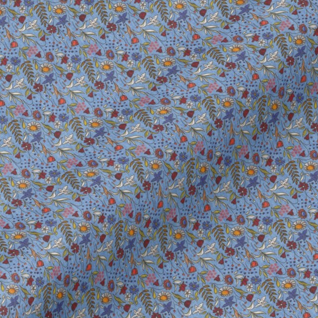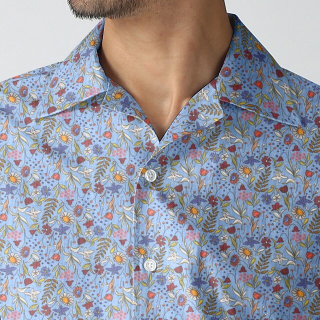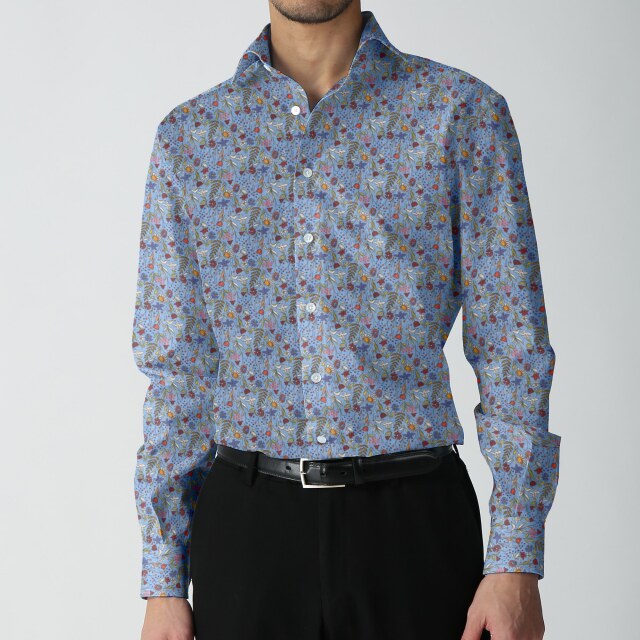 花柄プリントシャツ生地-ブルー | ブルーのイラストチックなプリントシャツ生地。カジュアルシャツ向き。