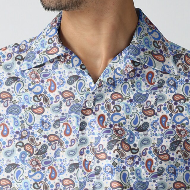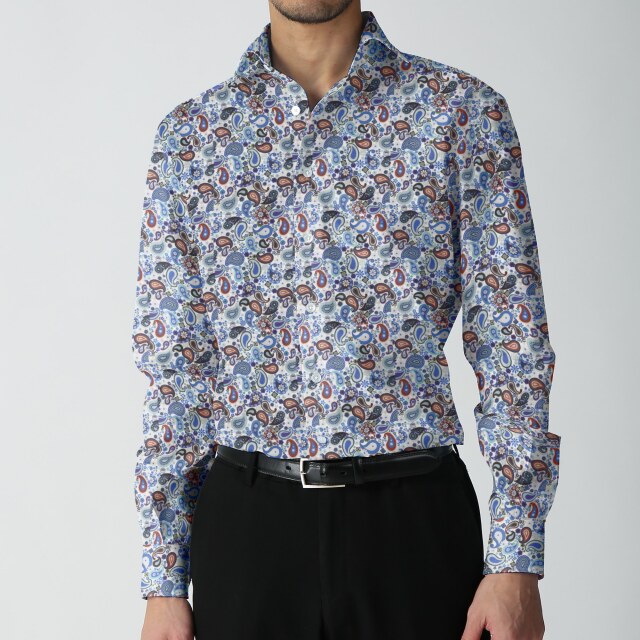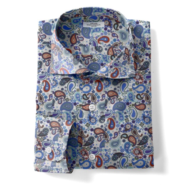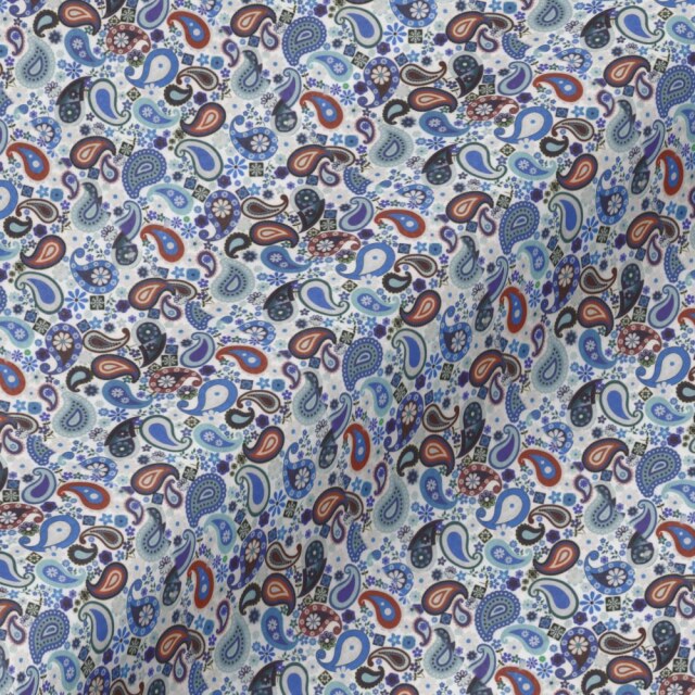 ペーズリープリントシャツ生地-ブルー | ブルーのペーズリー柄のプリントシャツ生地。カジュアルシャツ向き。