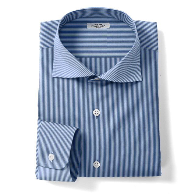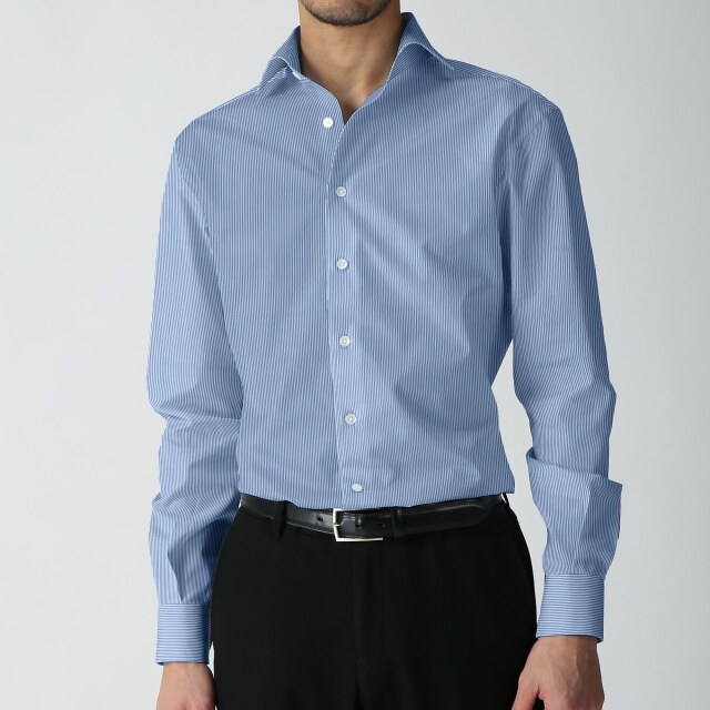 ポプリンテラ・サウザンドストライプ-ブルー | ネイビー地に鉛筆で描いたような細い白のストライプ。ドレスシャツ向き。